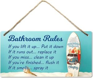 A Coastal “Bathroom Rules” beach sign can bring a cozy vibe to any room, especially if you like Funny Bathroom Decor with a relaxed ocean theme. Instead of plain artwork, this sign adds a little charm with blue colors and beach-style details. It fits well in a cottage, a guest bathroom, or even a teenage room that needs a fun touch. Some designs even include Turkish patterns or simple mens humor to make people smile. Whether you love the ocean or just want something lighthearted, this beach sign keeps the space playful and welcoming.