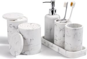 A Marble Vanity Accessory Set can make any space look modern and clean, especially if you love Marble Bathroom Decor. Moreover, the smooth surface and simple colors fit well in a cabin, a tiny dorm room, or even a stylish home. You can place your items on a matching tray and add small touches like a butterfly sticker, coral decoration, or even a silver or gold accent for extra shine. Some guys like to mix in fun items such as a rubber duck to keep the look playful. Overall, it creates decorative bathroom decor that feels both fresh and personal.